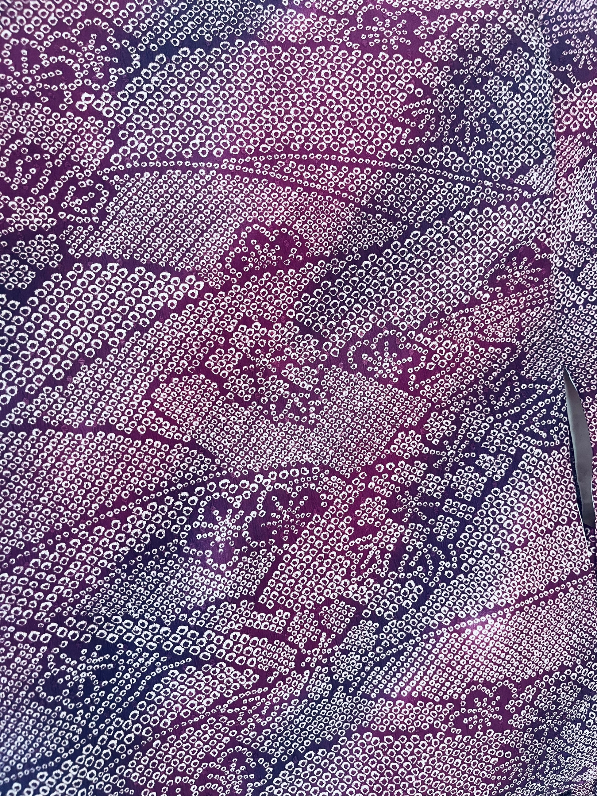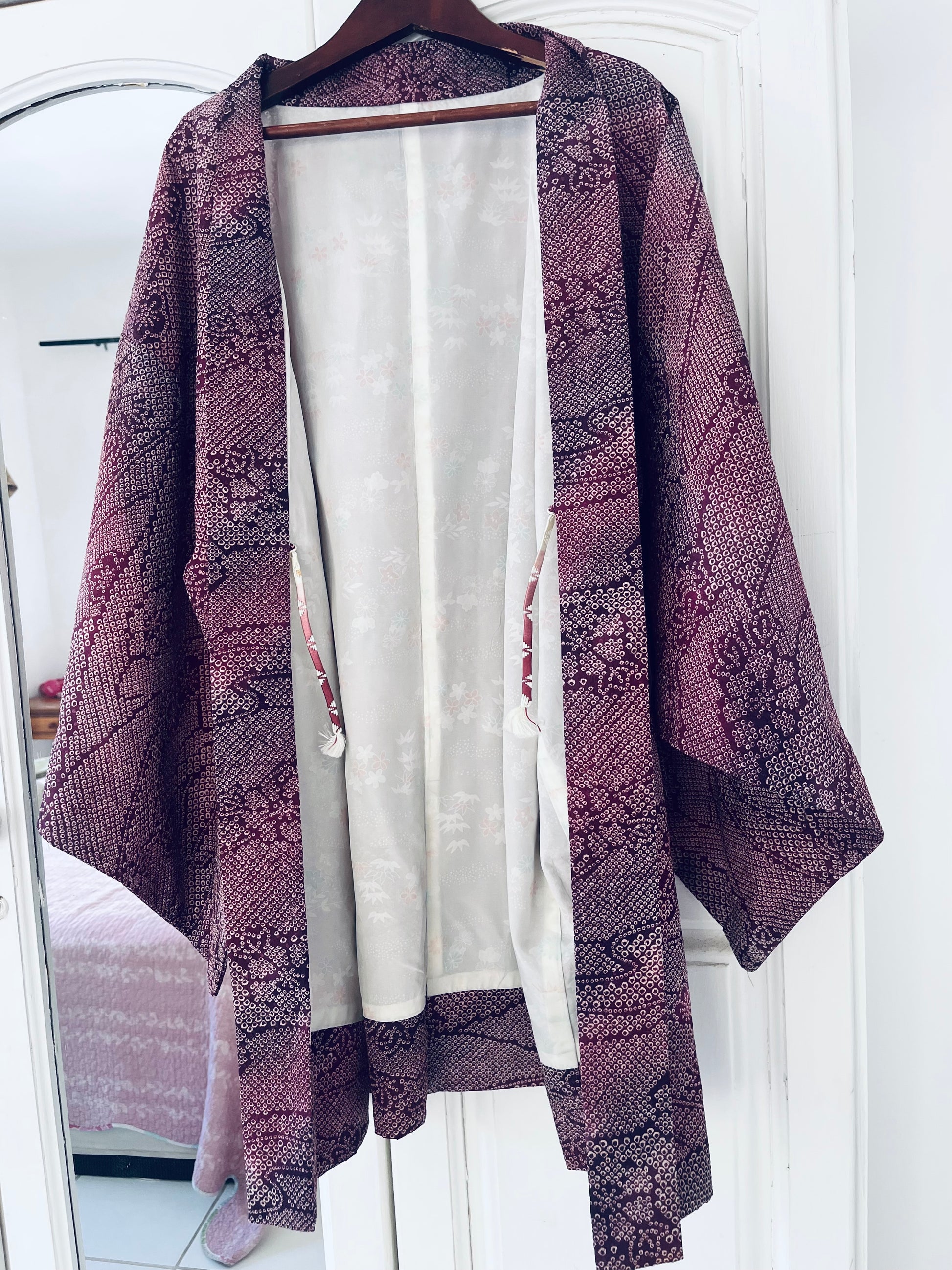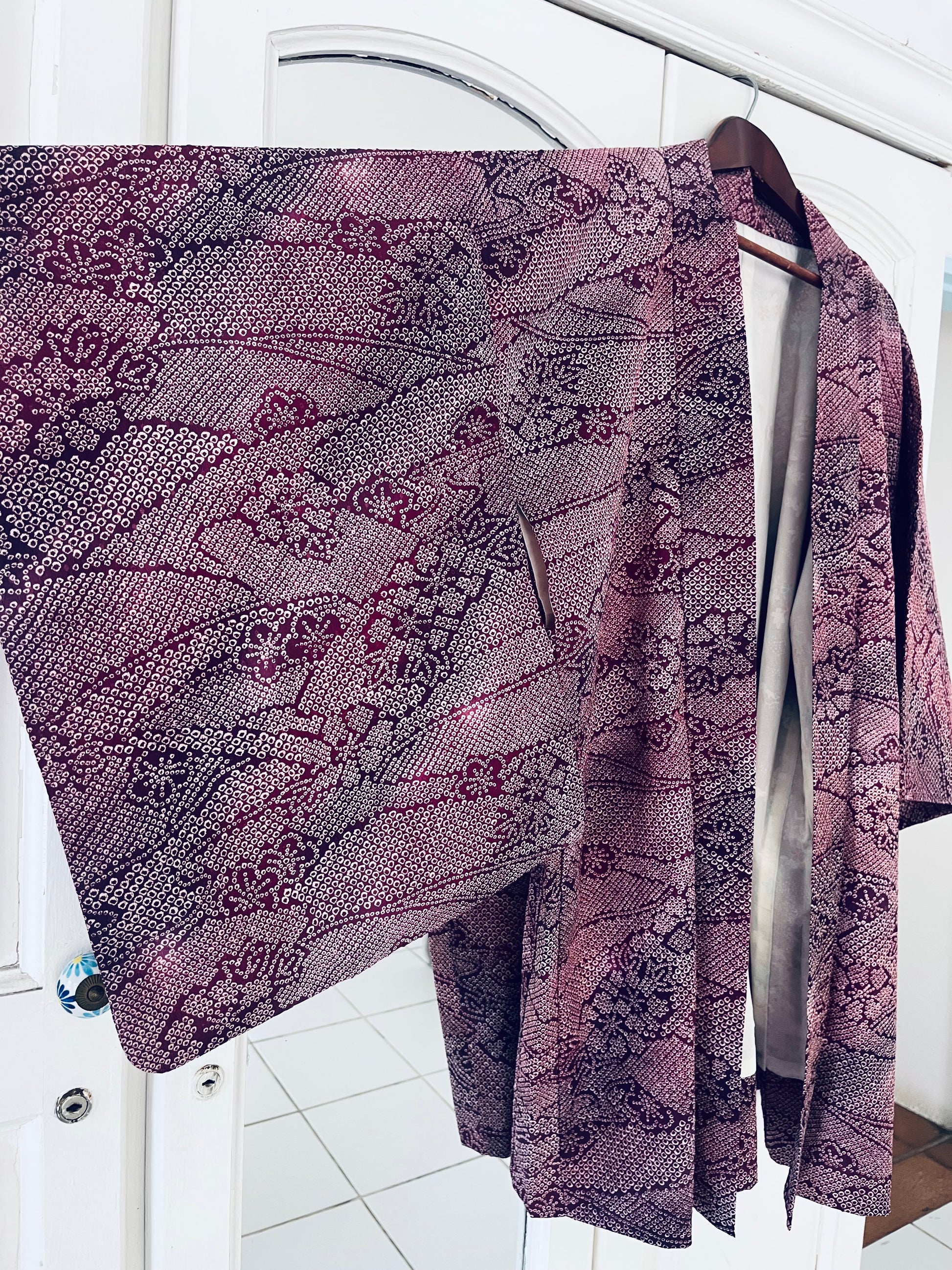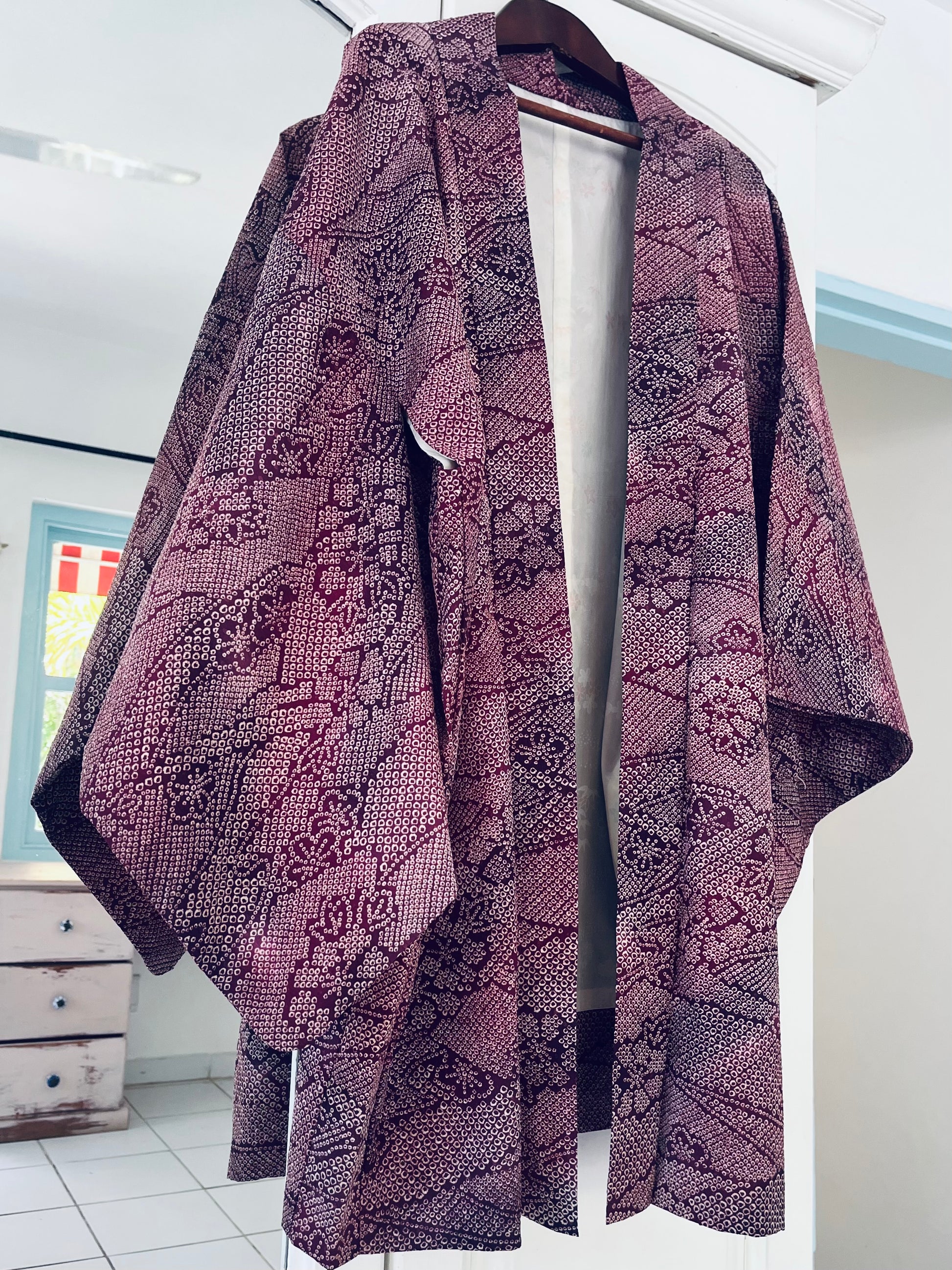 A study in patience and precision, Mulberry Quiet is a vintage Japanese haori crafted in finely detailed shibori silk. Thousands of tiny hand-dyed dots form layered botanical patterns across a deep mulberry and plum ground — a surface that feels alive, textured, and quietly luxurious.