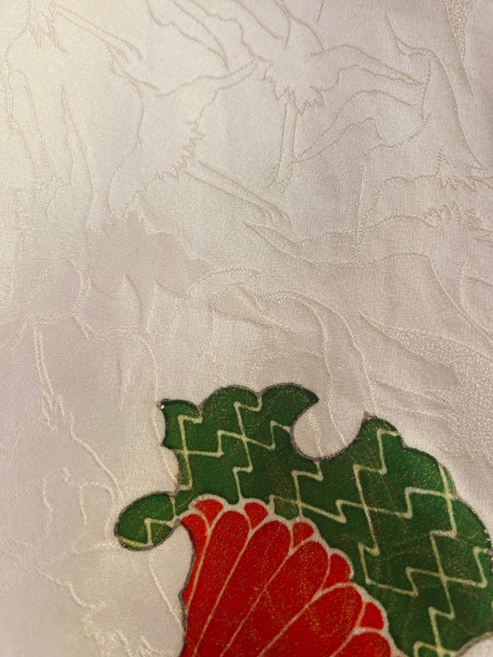 The harmony between the creamy silk and bold colorwork is unmistakably Japanese — celebratory yet serene, timeless yet alive. A rare composition of texture, symbolism, and artistry that transcends eras.