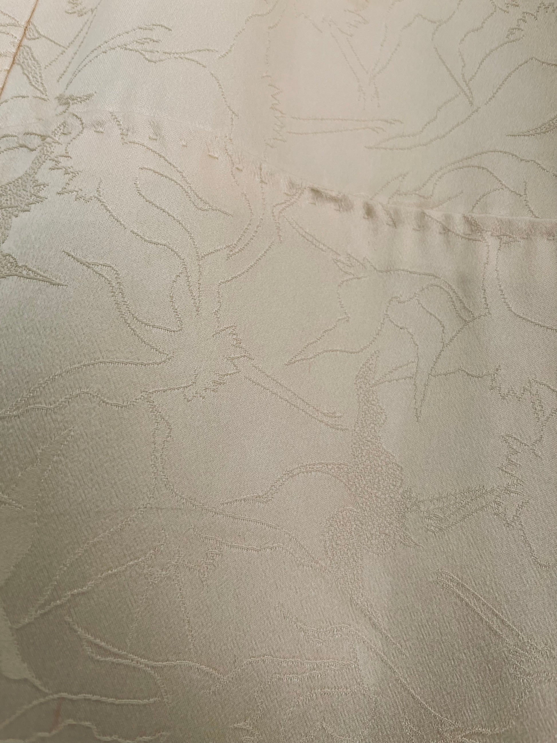 This rare vintage kimono in soft ivory carries the quiet shimmer of rinzu — a premium silk jacquard woven with cranes (tsuru), symbols of longevity and grace. The fabric itself is art — textured with flight, movement, and the serenity of tradition.